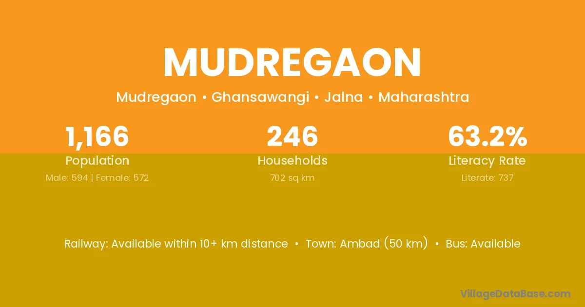 Mudregaon village has a total population of 1,166 people, of which 594 are males and 572 are females.