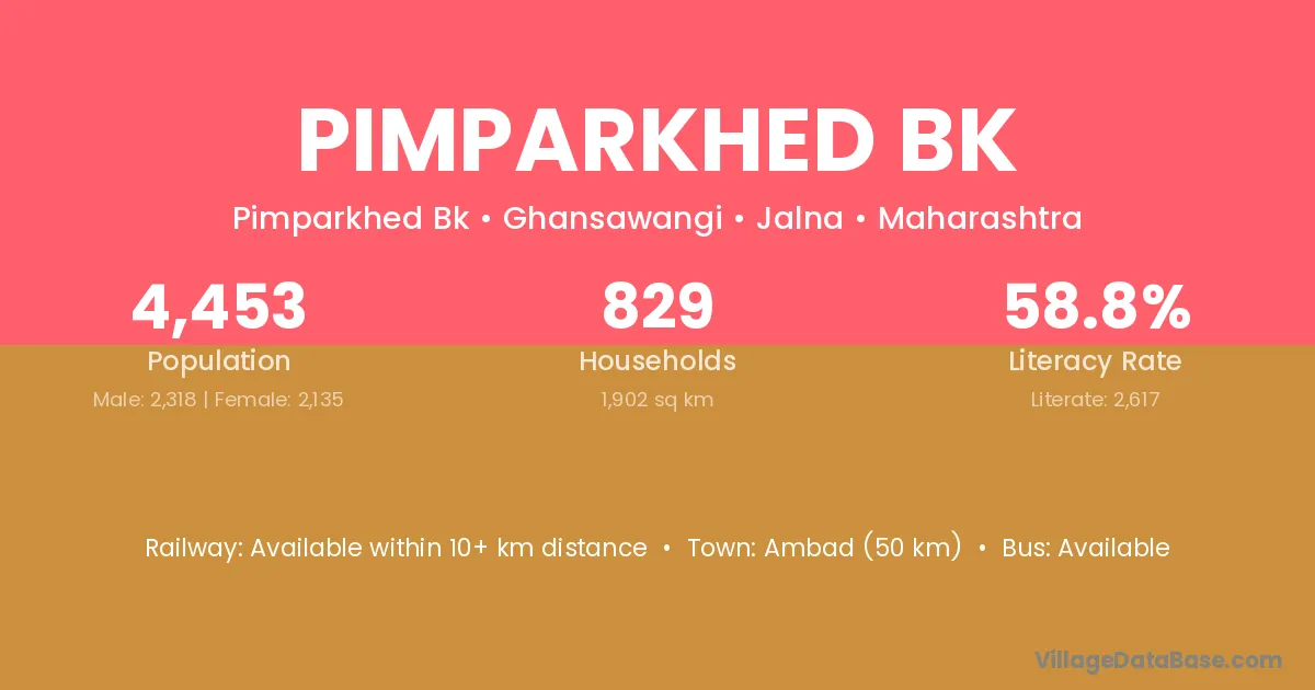 Ambad (50 km) is the nearest town to Pimparkhed Bk village for major economic activities and is located approximately 50 km away.