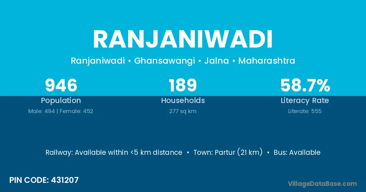 Partur (21 km) is the nearest town to Ranjaniwadi village for major economic activities and is located approximately 21 km away.