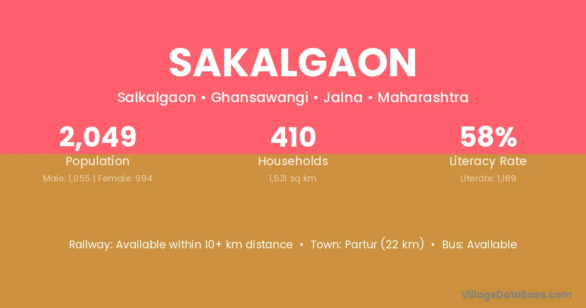Partur (22 km) is the nearest town to Sakalgaon village for major economic activities and is located approximately 22 km away.