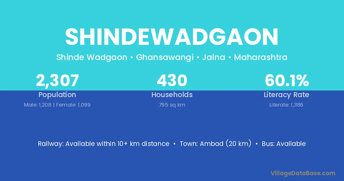 Ambad (20 km) is the nearest town to Shindewadgaon village for major economic activities and is located approximately 20 km away.