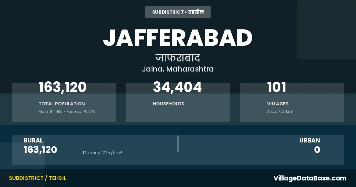 According to the 2011 census The total area of Jafferabad Tehsil is 725 km², with a population of 163120 people. The population density is 225 inhabitants per square kilometre, and there are approximately 34404 houses in the sub district.