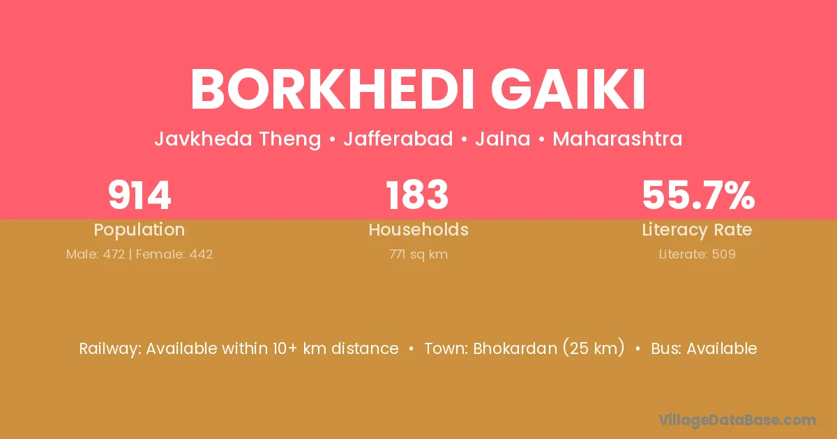 Bhokardan (25 km) is the nearest town to Borkhedi Gaiki village for major economic activities and is located approximately 25 km away.
