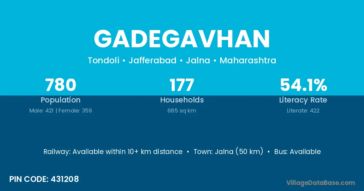 Jalna (50 km) is the nearest town to Gadegavhan village for major economic activities and is located approximately 50 km away.