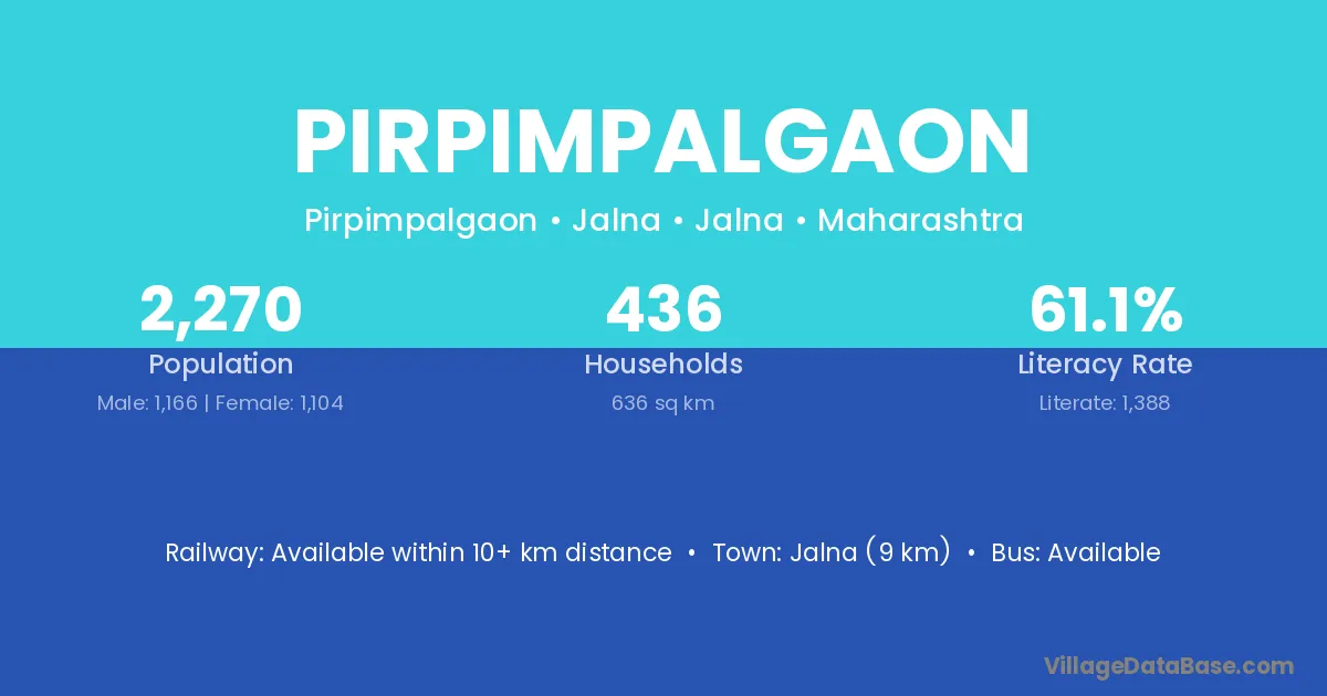 Jalna (9 km) is the nearest town to Pirpimpalgaon village for major economic activities and is located approximately 9 km away.