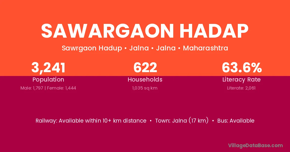 Jalna (17 km) is the nearest town to Sawargaon Hadap village for major economic activities and is located approximately 17 km away.