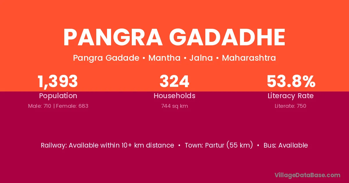 Partur (55 km) is the nearest town to Pangra Gadadhe village for major economic activities and is located approximately 55 km away.