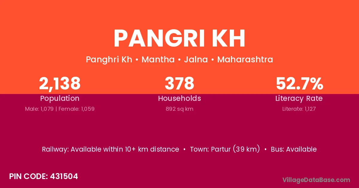 Partur (39 km) is the nearest town to Pangri Kh village for major economic activities and is located approximately 39 km away.