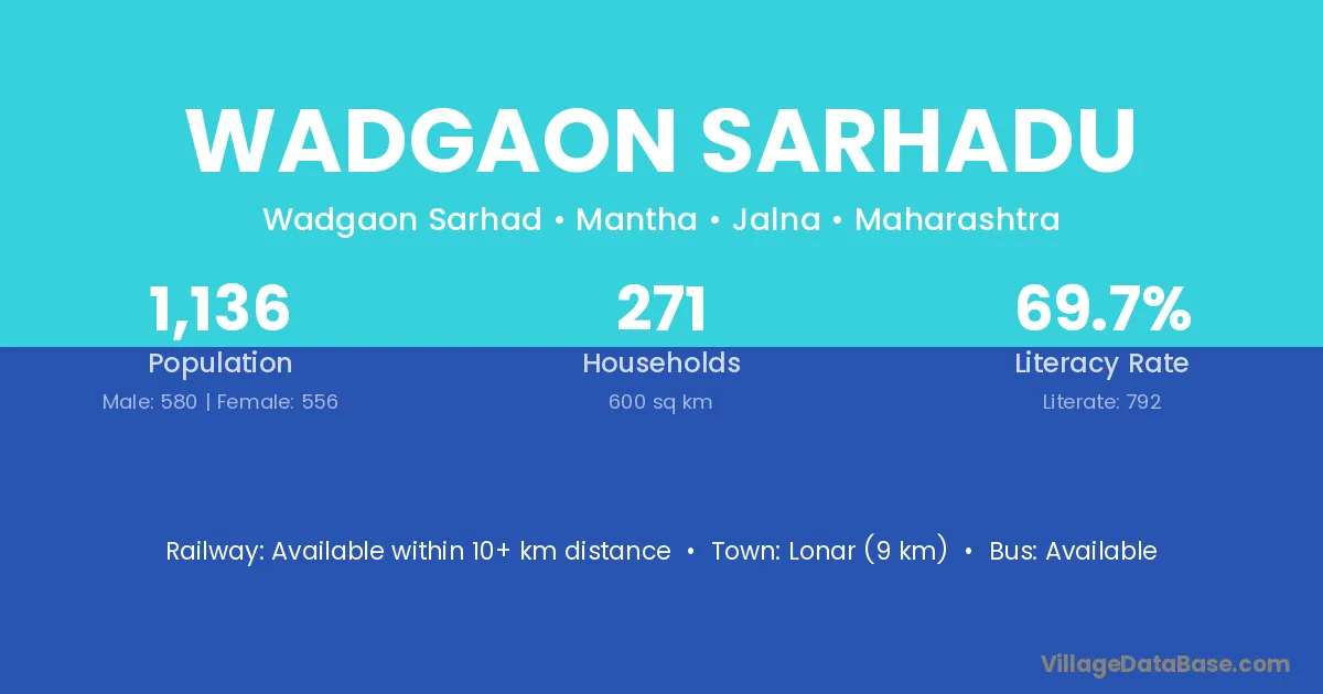 Lonar (9 km) is the nearest town to Wadgaon Sarhadu village for major economic activities and is located approximately 9 km away.