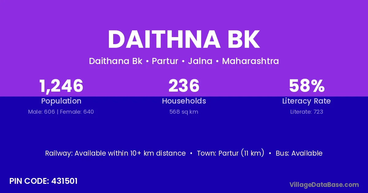Partur (11 km) is the nearest town to Daithna Bk village for major economic activities and is located approximately 11 km away.
