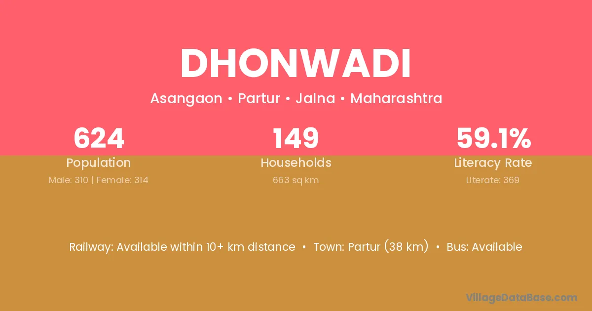 Dhonwadi village has a total population of 624 people, of which 310 are males and 314 are females.