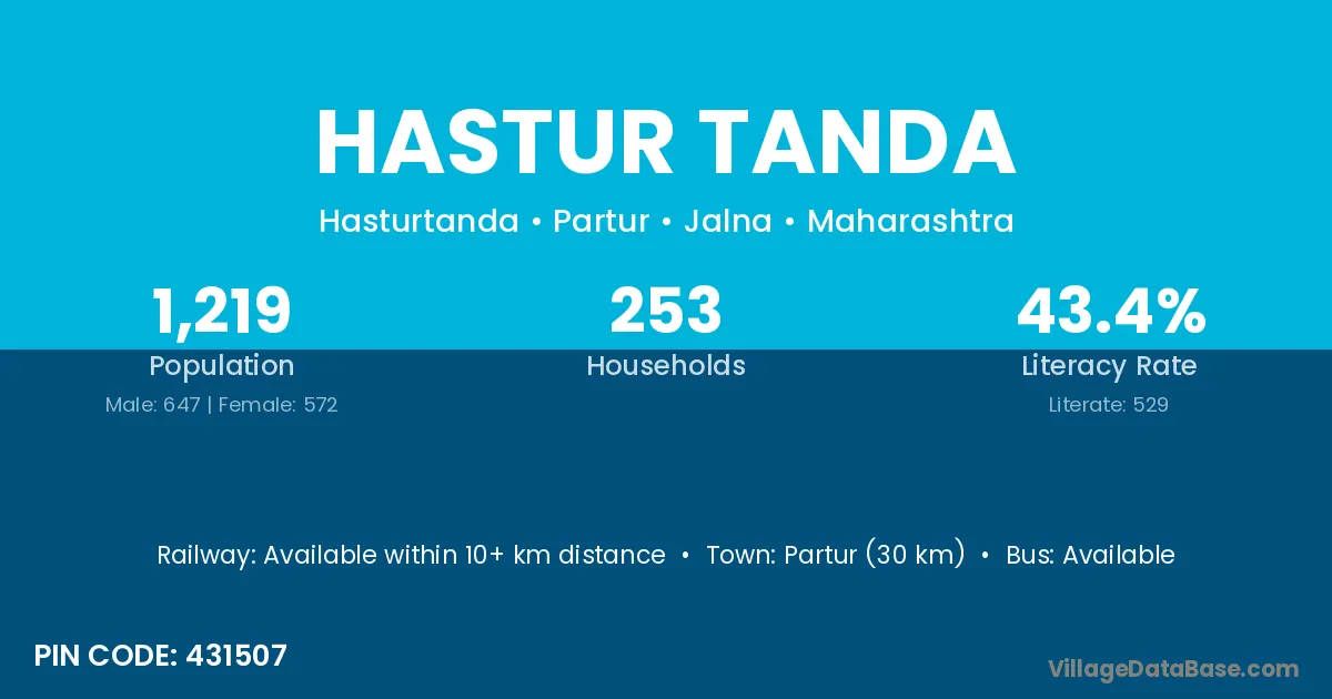 Partur (30 km) is the nearest town to Hastur Tanda village for major economic activities and is located approximately 30 km away.