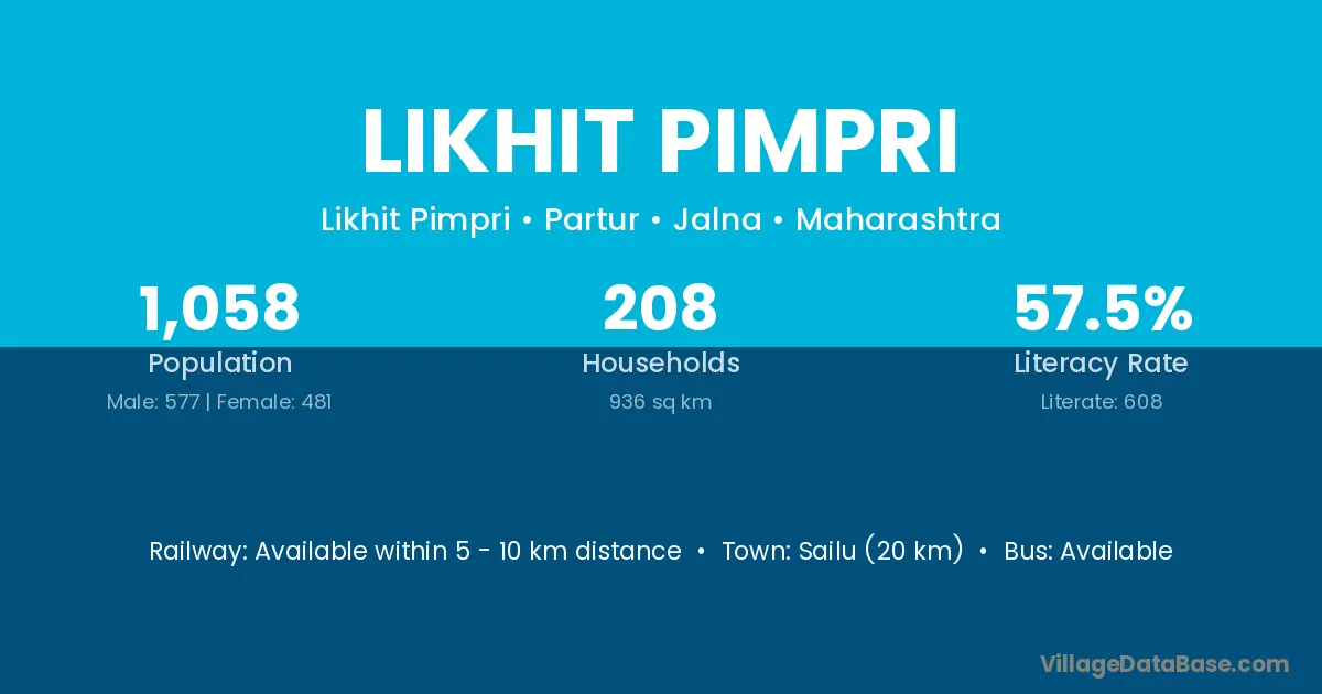 Sailu (20 km) is the nearest town to Likhit Pimpri village for major economic activities and is located approximately 20 km away.