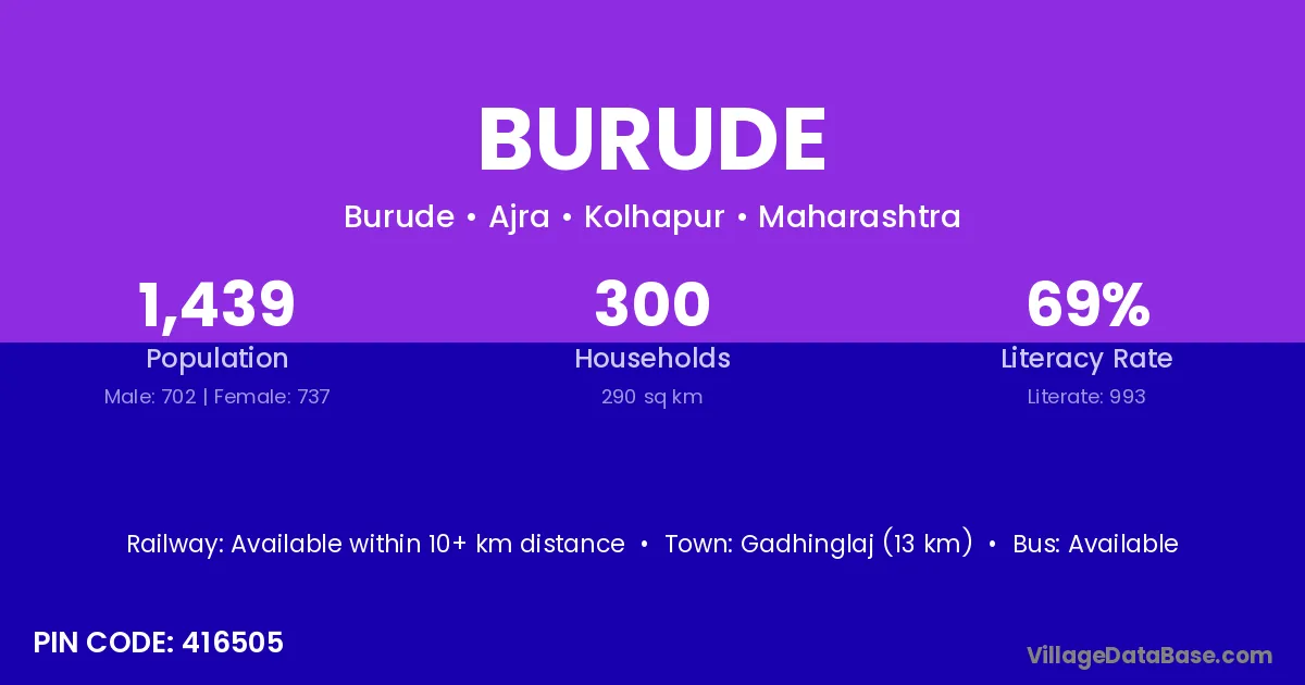 Gadhinglaj (13 km) is the nearest town to Burude village for major economic activities and is located approximately 13 km away.