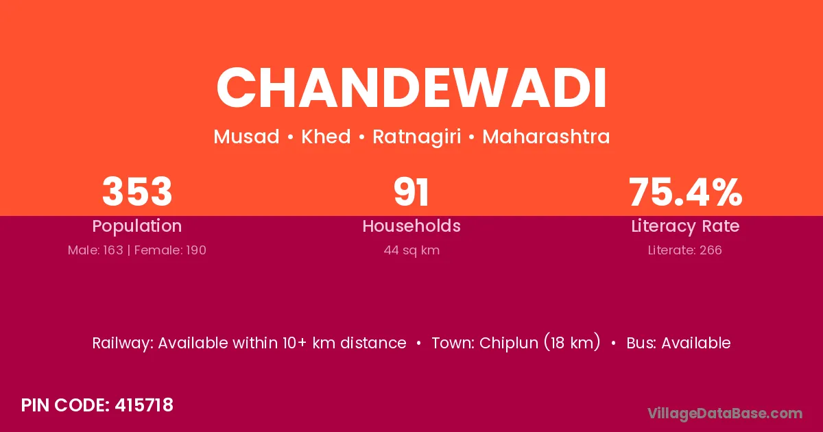 Chandewadi village has a total population of 404 people, of which 194 are males and 210 are females.
