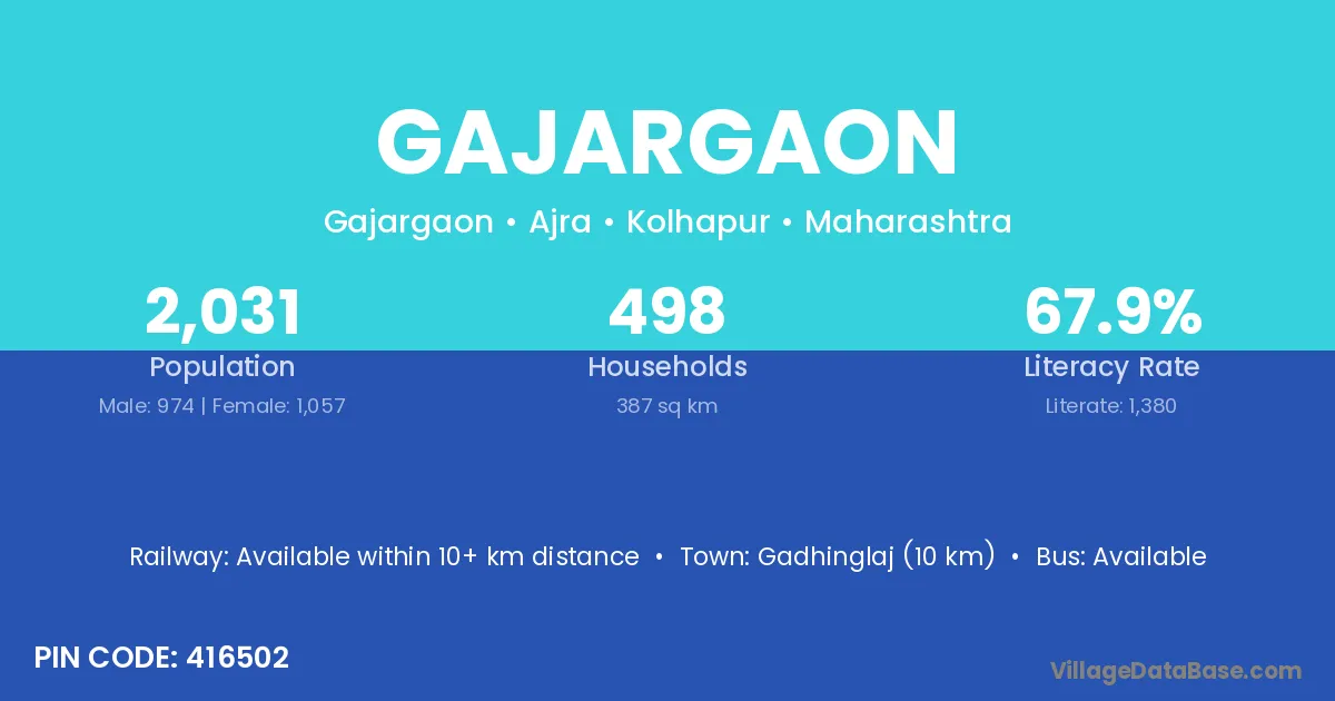 Gadhinglaj (10 km) is the nearest town to Gajargaon village for major economic activities and is located approximately 10 km away.
