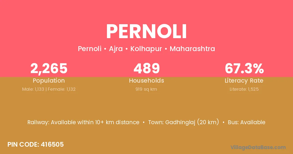 Gadhinglaj (20 km) is the nearest town to Pernoli village for major economic activities and is located approximately 20 km away.