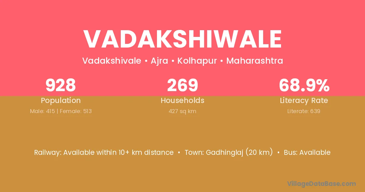 Vadakshiwale village has a total population of 928 people, of which 415 are males and 513 are females.