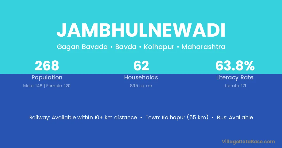 Kolhapur (55 km) is the nearest town to Jambhulnewadi village for major economic activities and is located approximately 55 km away.
