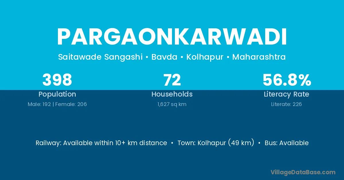 Pargaonkarwadi village has a total population of 398 people, of which 192 are males and 206 are females.