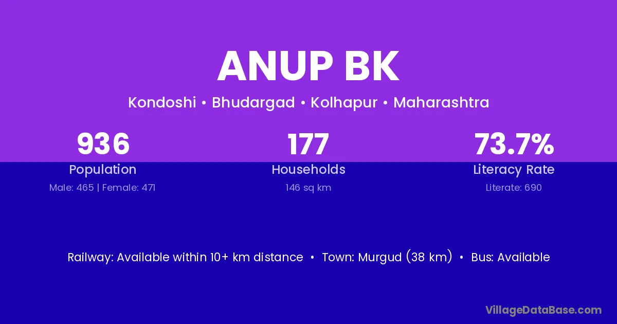 Murgud (38 km) is the nearest town to Anup Bk village for major economic activities and is located approximately 38 km away.