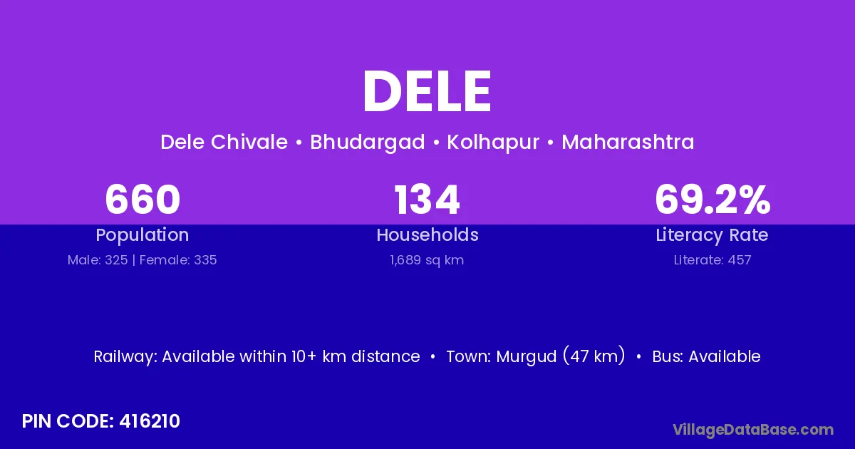 Murgud (47 km) is the nearest town to Dele village for major economic activities and is located approximately 47 km away.