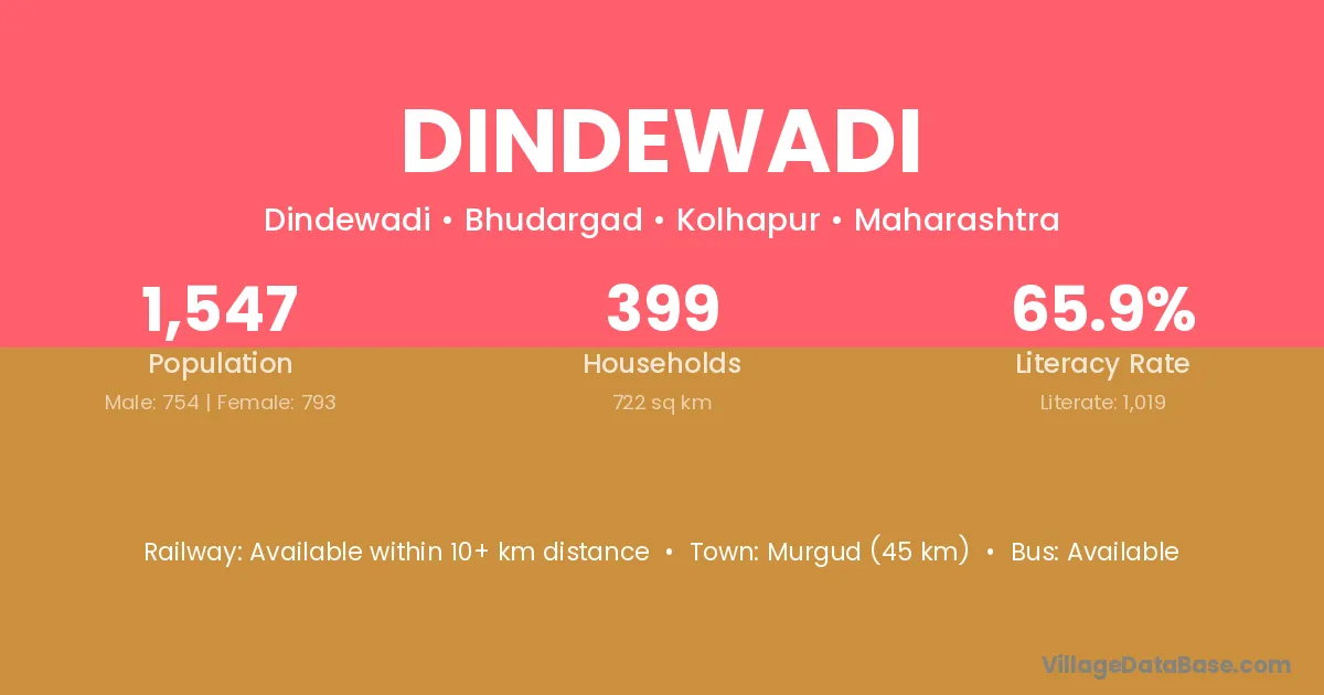 Murgud (45 km) is the nearest town to Dindewadi village for major economic activities and is located approximately 45 km away.