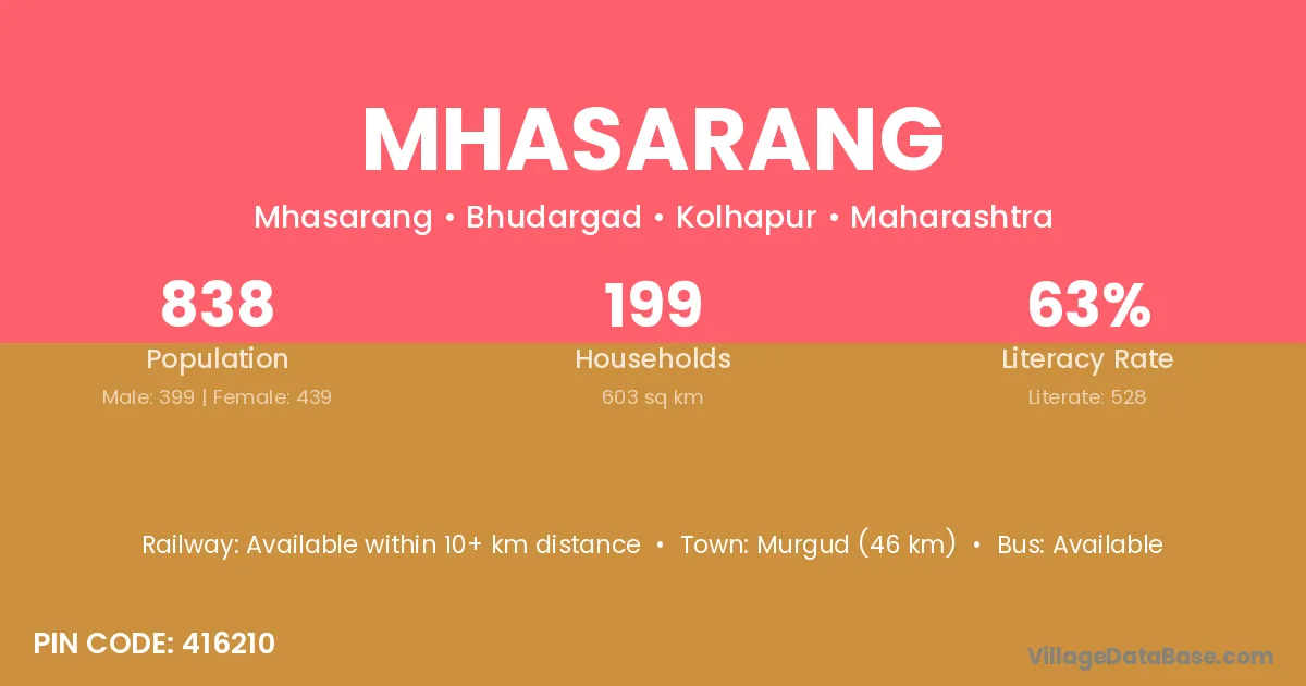 Murgud (46 km) is the nearest town to Mhasarang village for major economic activities and is located approximately 46 km away.