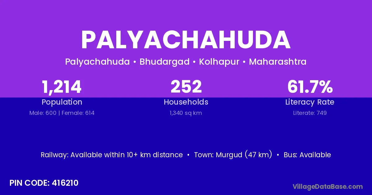 Murgud (47 km) is the nearest town to Palyachahuda village for major economic activities and is located approximately 47 km away.