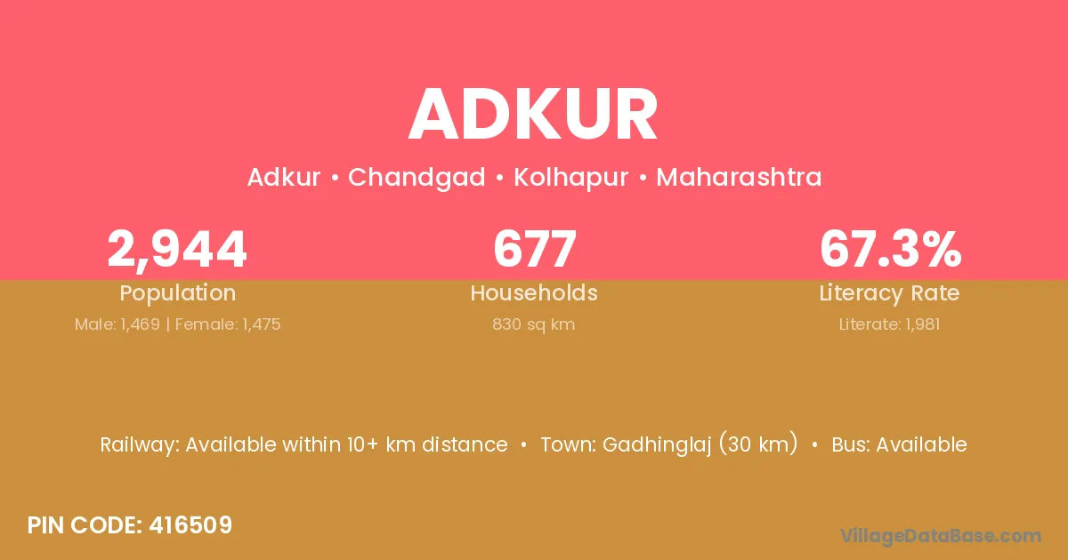 Gadhinglaj (30 km) is the nearest town to Adkur village for major economic activities and is located approximately 30 km away.