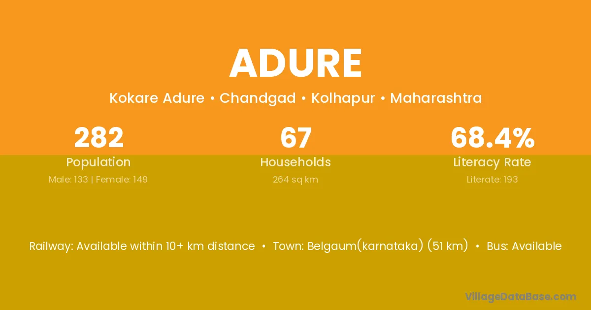 Belgaum(karnataka) (51 km) is the nearest town to Adure village for major economic activities and is located approximately 51 km away.
