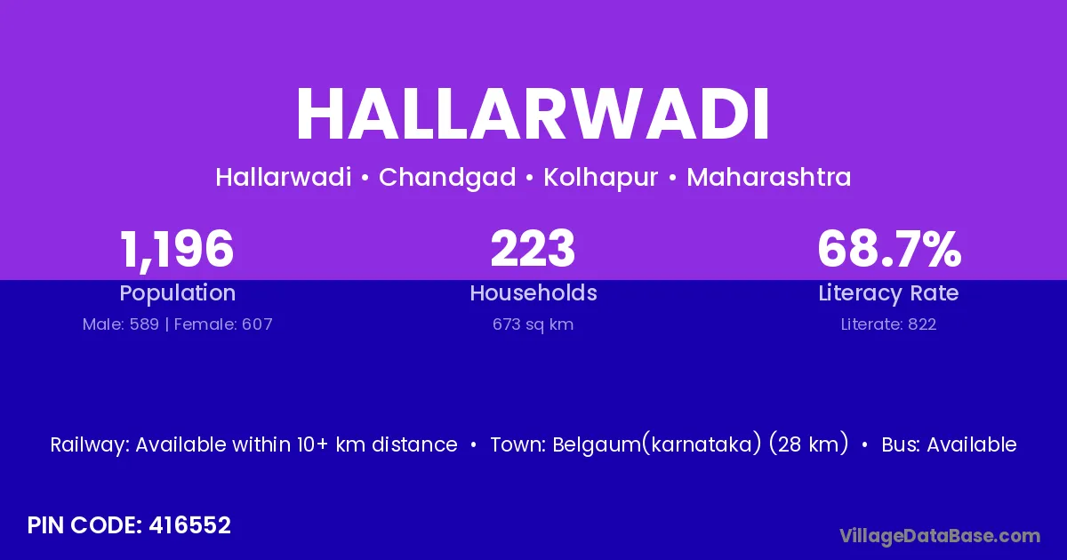 Hallarwadi village has a total population of 1,196 people, of which 589 are males and 607 are females.