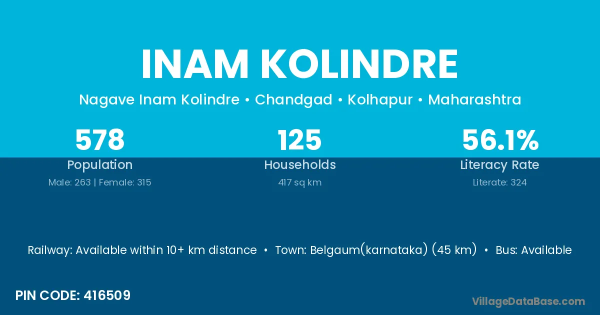 Inam Kolindre village has a total population of 578 people, of which 263 are males and 315 are females.
