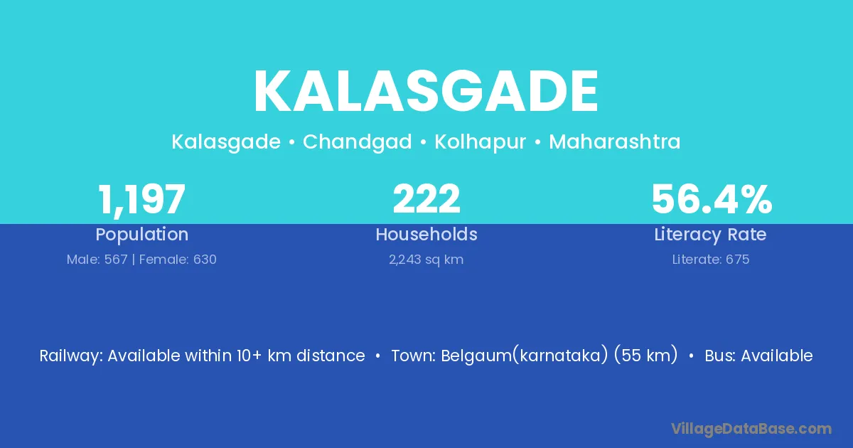 Kalasgade village has a total population of 1,197 people, of which 567 are males and 630 are females.