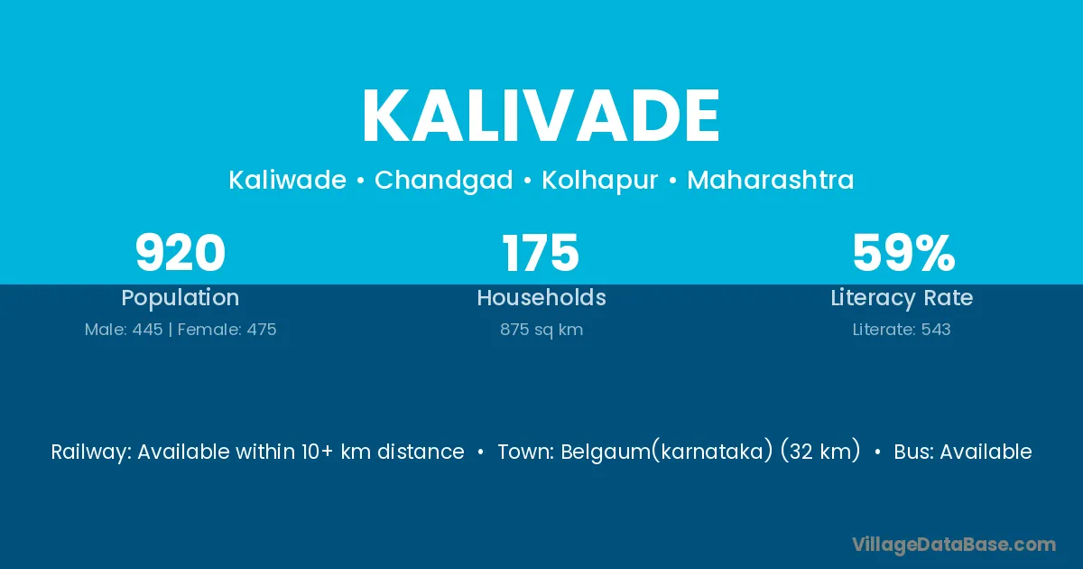 Belgaum(karnataka) (32 km) is the nearest town to Kalivade village for major economic activities and is located approximately 32 km away.