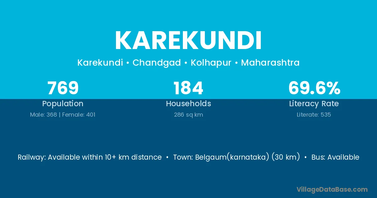 Belgaum(karnataka) (30 km) is the nearest town to Karekundi village for major economic activities and is located approximately 30 km away.