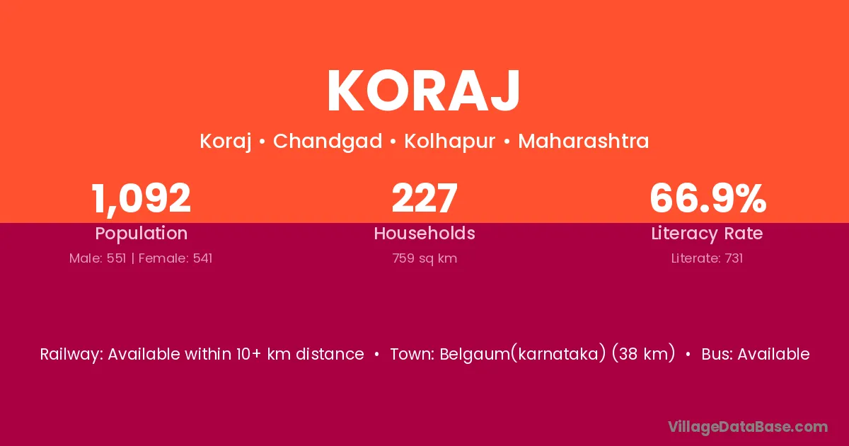 Belgaum(karnataka) (38 km) is the nearest town to Koraj village for major economic activities and is located approximately 38 km away.