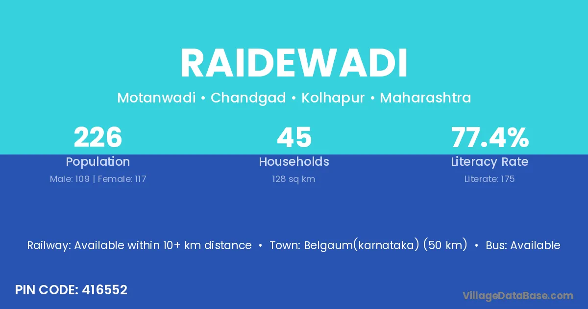 Raidewadi village has a total population of 226 people, of which 109 are males and 117 are females.
