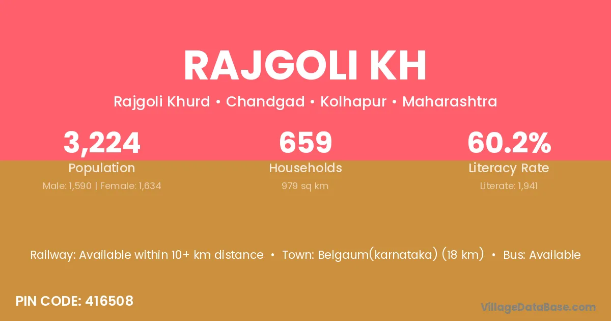 Rajgoli Kh village has a total population of 3,224 people, of which 1,590 are males and 1,634 are females.