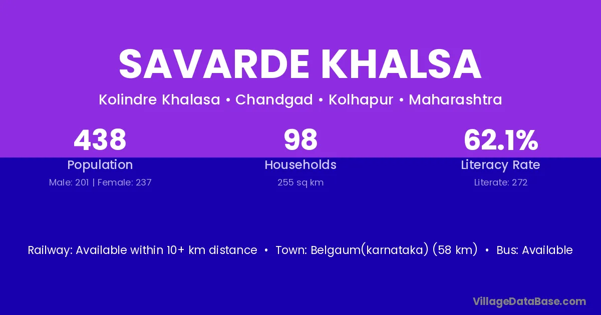 Belgaum(karnataka) (58 km) is the nearest town to Savarde Khalsa village for major economic activities and is located approximately 58 km away.
