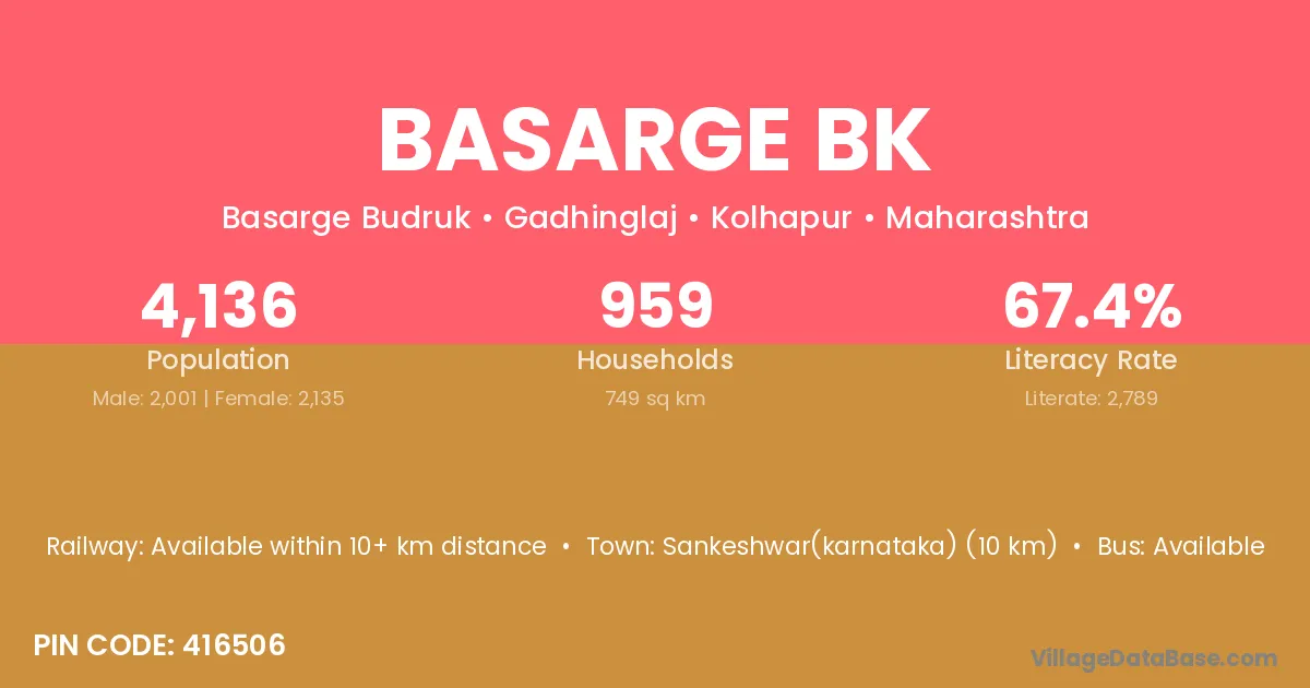 Sankeshwar(karnataka) (10 km) is the nearest town to Basarge Bk village for major economic activities and is located approximately 10 km away.