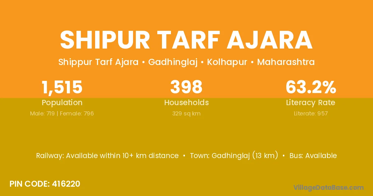 Gadhinglaj (13 km) is the nearest town to Shipur Tarf Ajara village for major economic activities and is located approximately 13 km away.