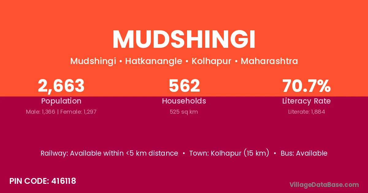 Mudshingi village has a total population of 2,663 people, of which 1,366 are males and 1,297 are females.
