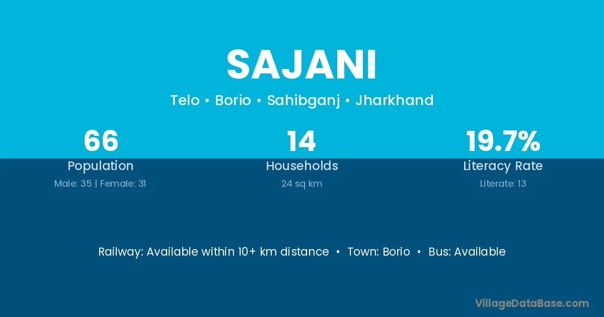 The literacy rate of Sajani village is 76.23%. Male literacy stands at 81.29% and female literacy at 70.92%.