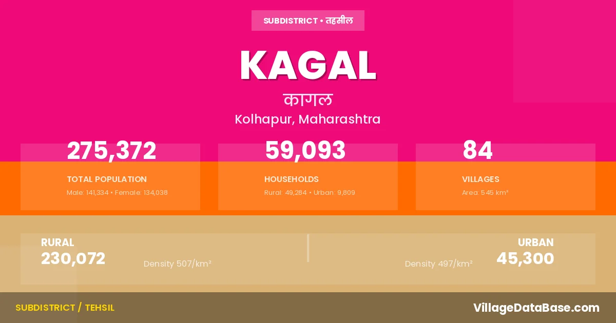 According to the 2011 census The total area of Kagal Tehsil is 545 km², with a population of 275372 people. The population density is 505 inhabitants per square kilometre, and there are approximately 59093 houses in the sub district.