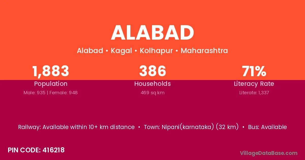 Nipani(karnataka) (32 km) is the nearest town to Alabad village for major economic activities and is located approximately 32 km away.