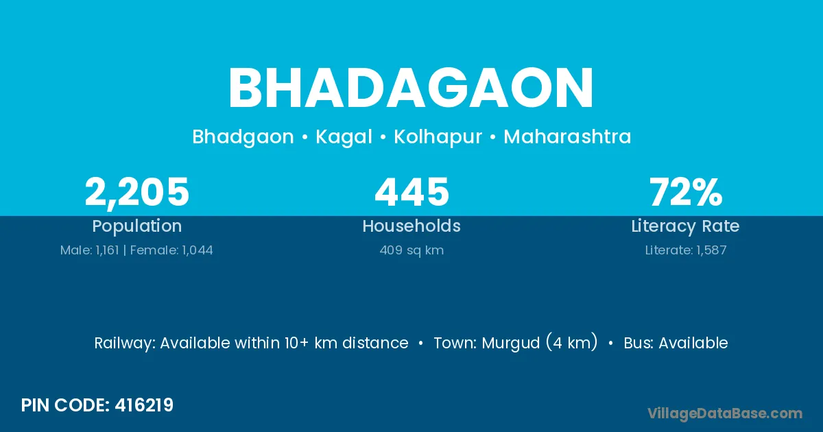 Murgud (4 km) is the nearest town to Bhadagaon village for major economic activities and is located approximately 4 km away.