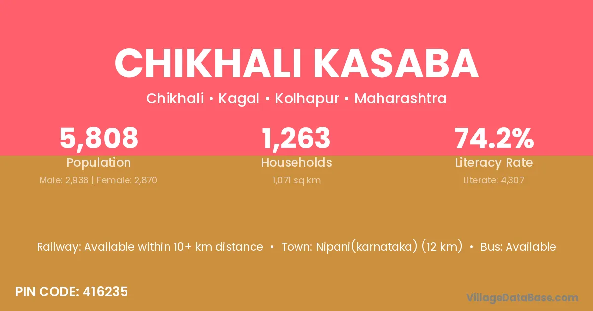 Nipani(karnataka) (12 km) is the nearest town to Chikhali Kasaba village for major economic activities and is located approximately 12 km away.