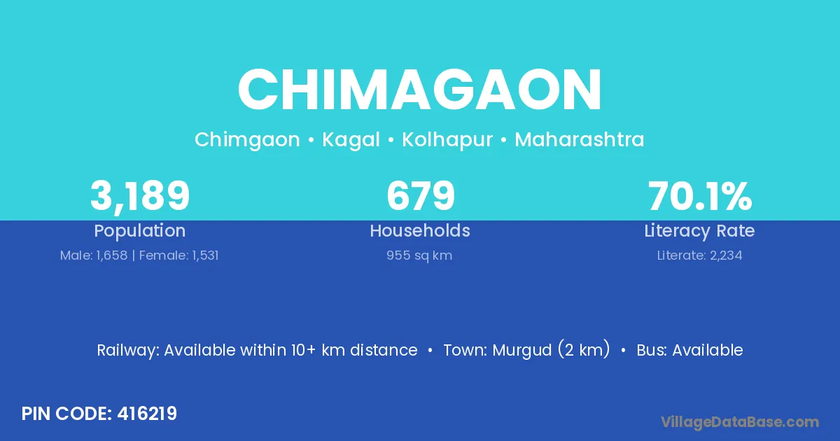 Murgud (2 km) is the nearest town to Chimagaon village for major economic activities and is located approximately 2 km away.