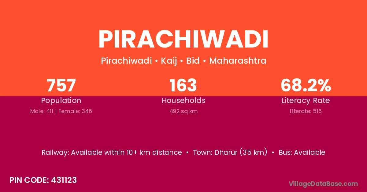 Murgud (25 km) is the nearest town to Pirachiwadi village for major economic activities and is located approximately 25 km away.